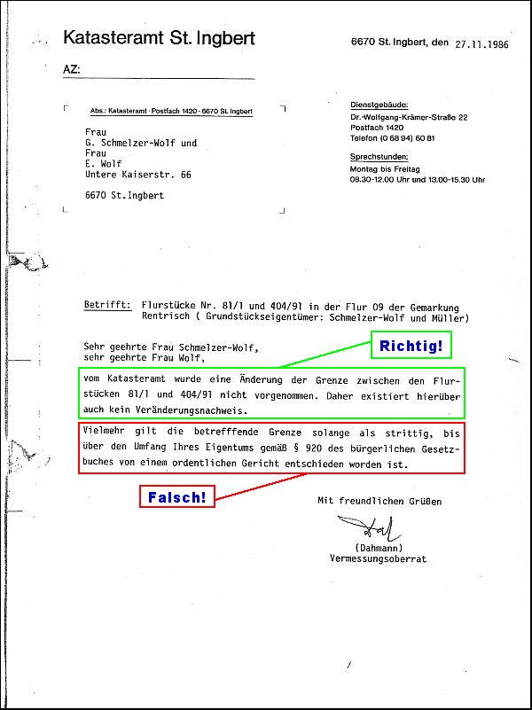 Nachfolgend das Schreiben des Leiters des Katasteramts St. Ingbert, Dahmann, vom 27. November 1986, welches für den vorliegenden Fall in zweierlei Hinsicht von Bedeutung ist.